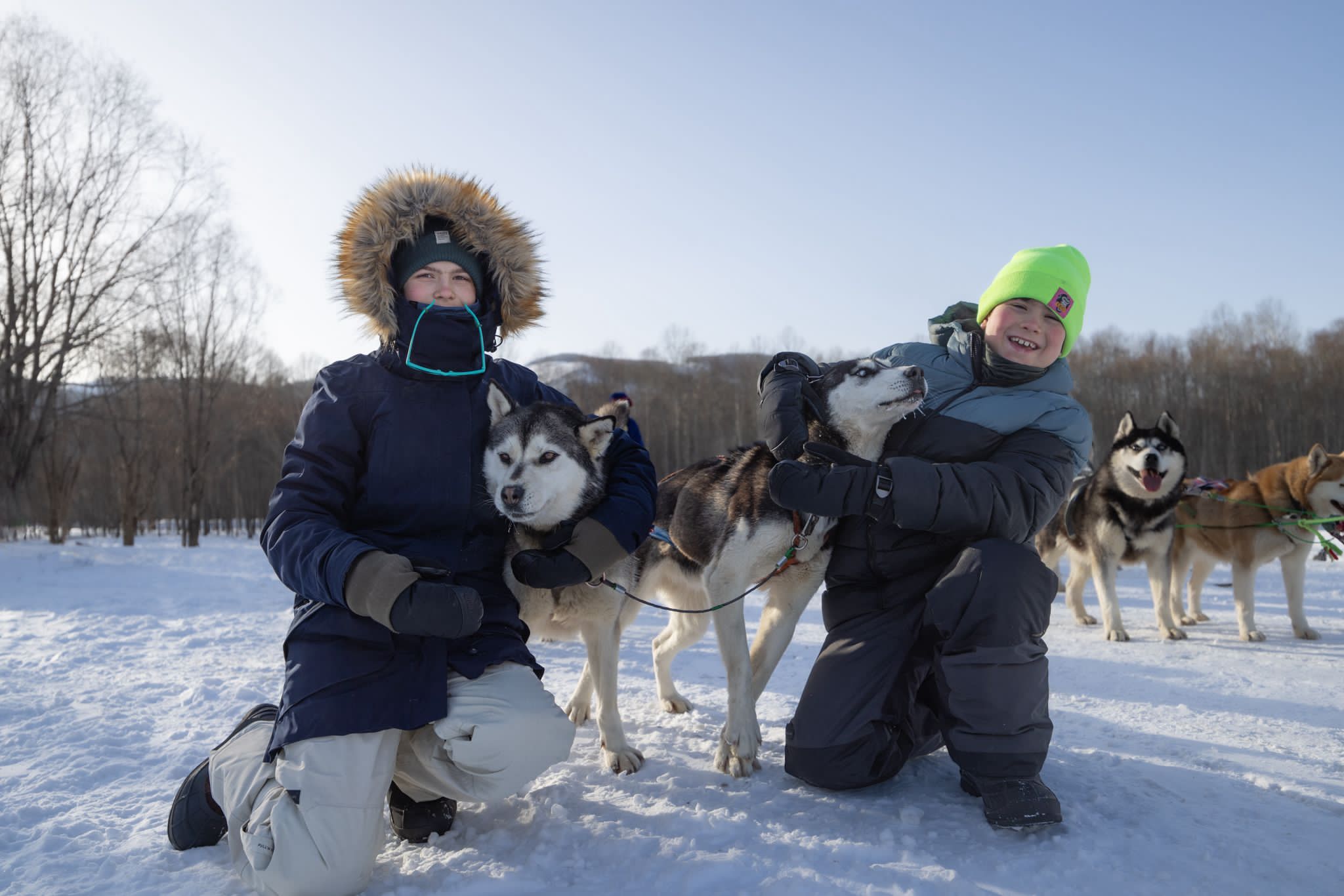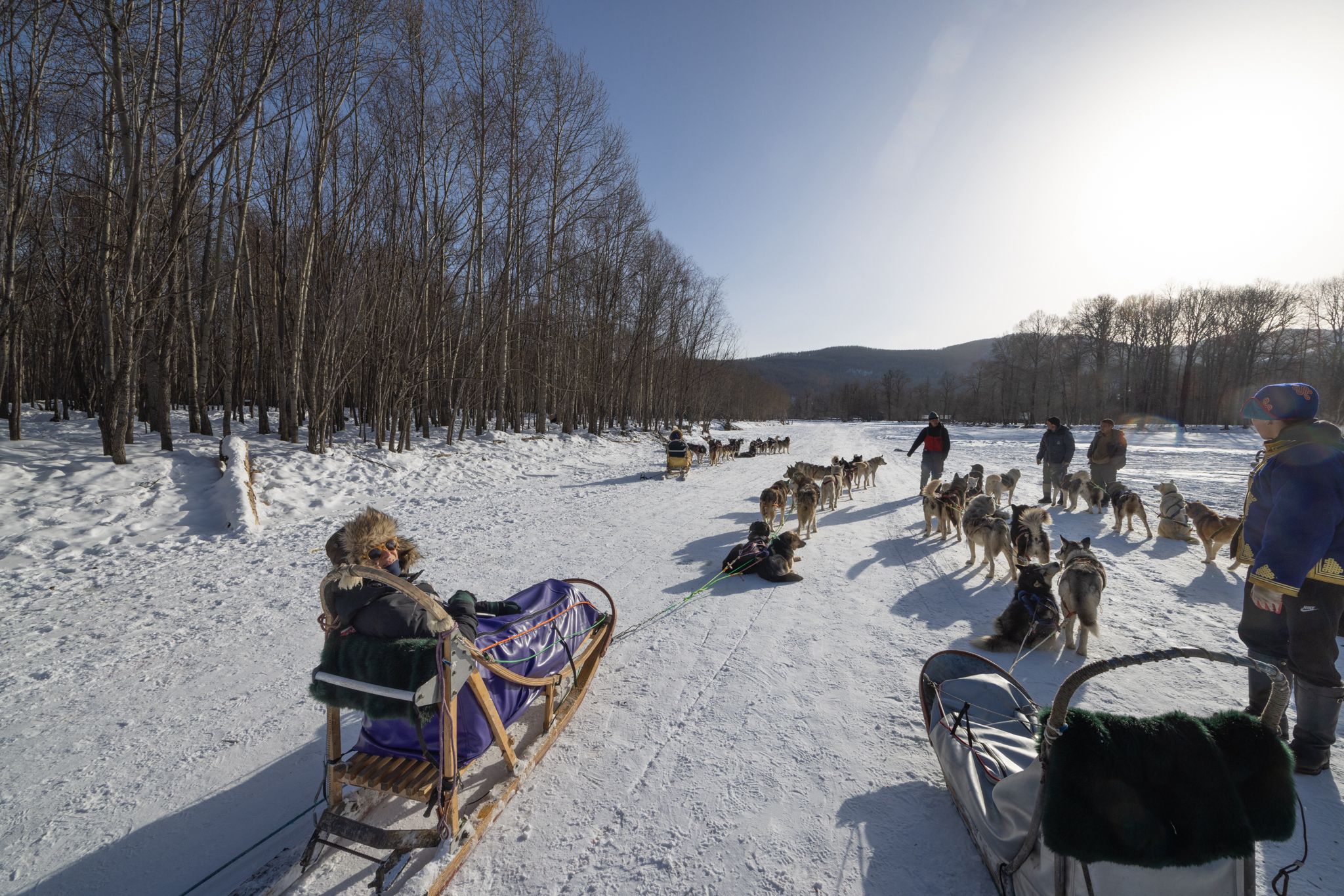 Dog sledding in Terelj National Park — glide across pristine snowfields framed by dramatic granite formations and pine forests.